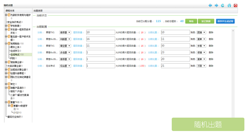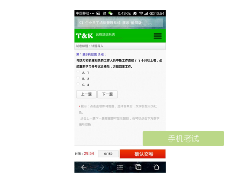 在線考試答題系統、在線培訓考試系統、在線考試培訓系統、網絡在線學習培訓考試系統 考試系統是目前市場上最專業的遠程網絡考試系統,適合政府、 學校及企業的各種形式在線考試、競賽、練習等應用,全面實現了考試工作的網絡化、無紙化、自動化。該系統采用新一代純B/S架構,用于INTERNET和局域網在線考試,可以承載大規模在線考試的需求,而且對服務器的配置要求非常低,客戶端不用任何設置。通過強i大的后臺設置功能,用戶可以根據自身需要設定考試功能,幾乎能滿足企業、政府機構、教育單位的所有需求。