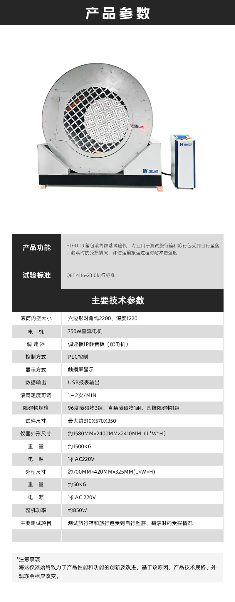 箱包滾筒跌落試驗(yàn)儀專業(yè)用于測(cè)試旅行箱和旅行包受到自行墜落、翻滾時(shí)的受損情況,評(píng)估運(yùn)輸搬運(yùn)過程時(shí)耐沖擊強(qiáng)度