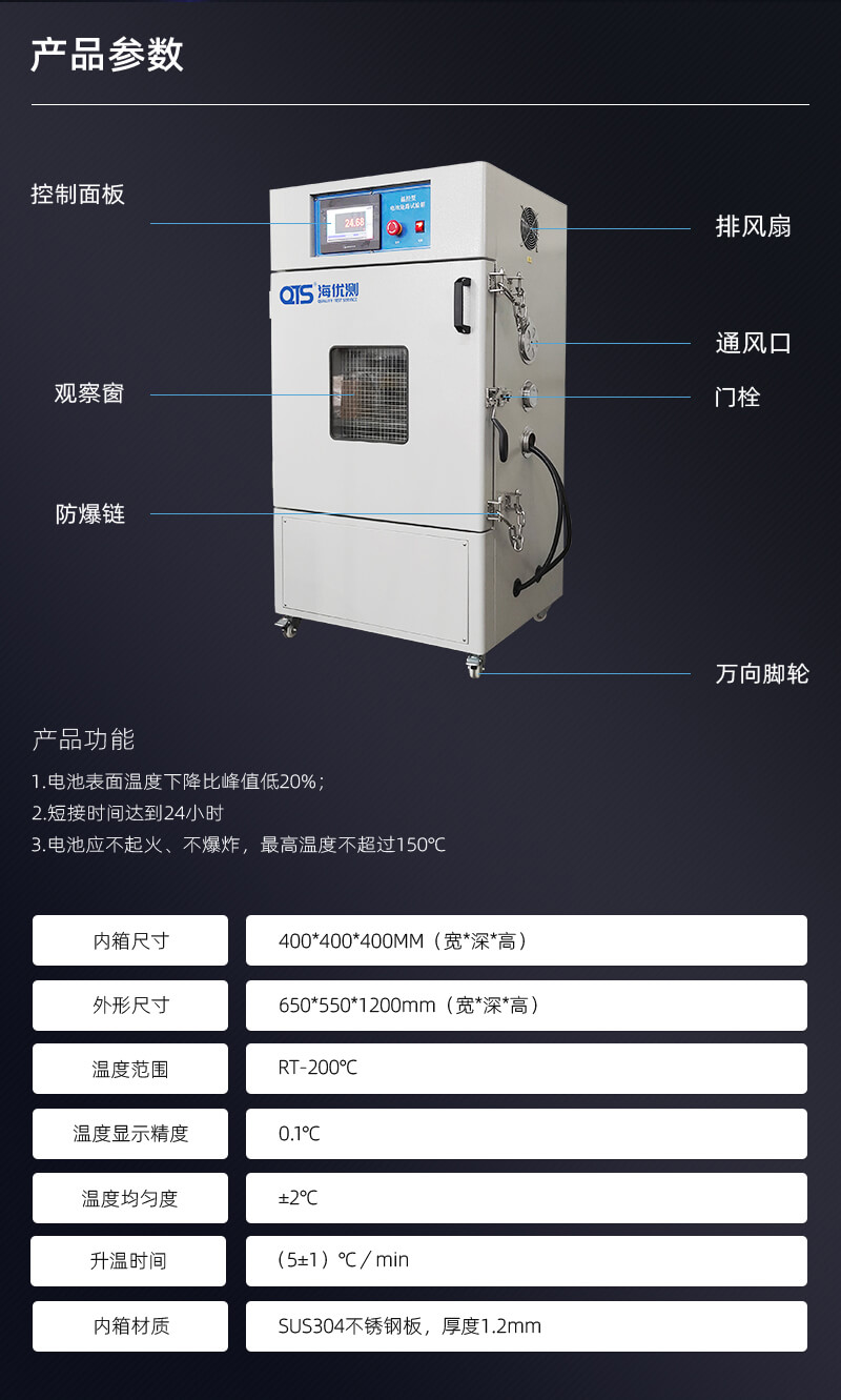 將充滿電的電池,放置一定的環(huán)境中,然后用導(dǎo)線連接電池正負(fù)極端,并保證全部外部電阻值嗎,試驗(yàn)過程中監(jiān)測(cè)電池表面溫度變化,當(dāng)出現(xiàn)下兩種情形之一時(shí),試驗(yàn)終止:電池應(yīng)不起火、不爆炸,最高溫度不超過150℃。