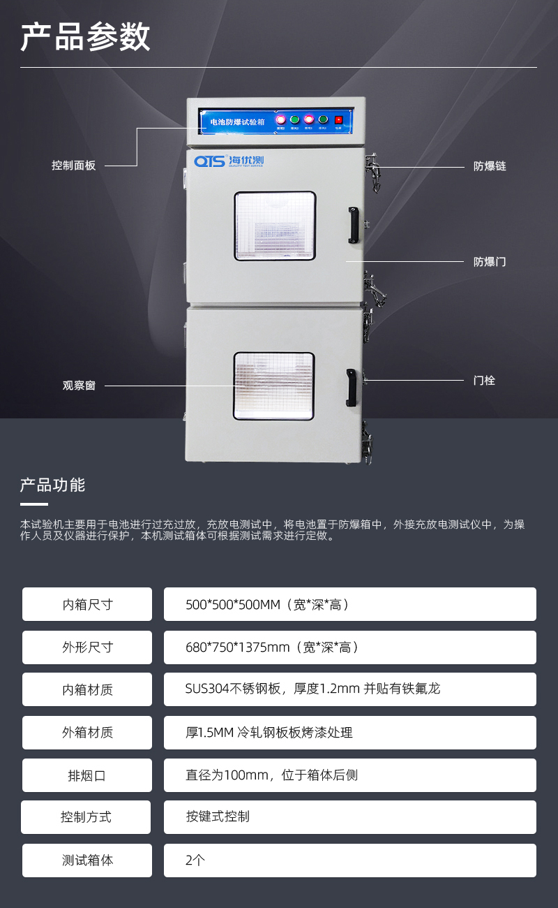 電池防爆試驗箱主要用于電池進(jìn)行過充過放,充放電測試中,將電池置于防爆箱中,外接充放電測試儀中,為操作人員及儀器進(jìn)行保護(hù),本機(jī)測試箱體可根據(jù)測試需求進(jìn)行定做。